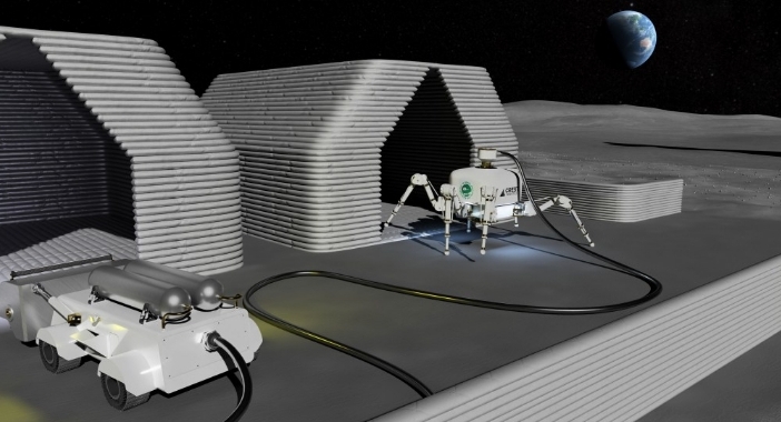 - Local Material Use: Regolith can be scooped, packed into fabric sleeves, compressed, and extruded into protective shelters, habitats, or storage facilities. Renders show Charlotte operating amid lunar domes, with Earth visible in the starry sky.